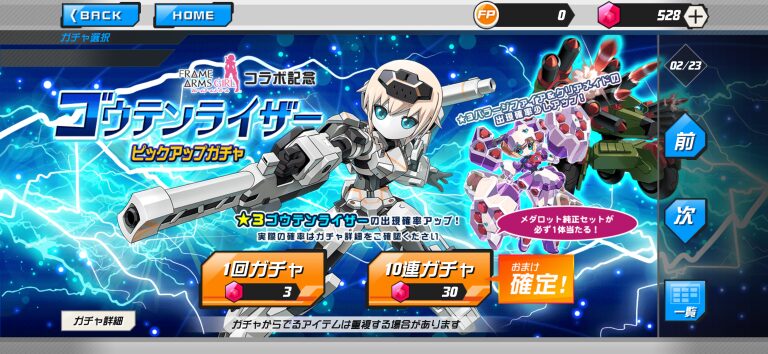 今日から始まったフレームアームズガールコラボ。おそらく全員女型なので、超襲来やリーグに備えてガチャ引きまくります!